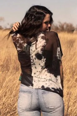 Women’s top featuring Aztec print sleeves, v-neck and round bottom hem. Soft body with stretchy sleeves.