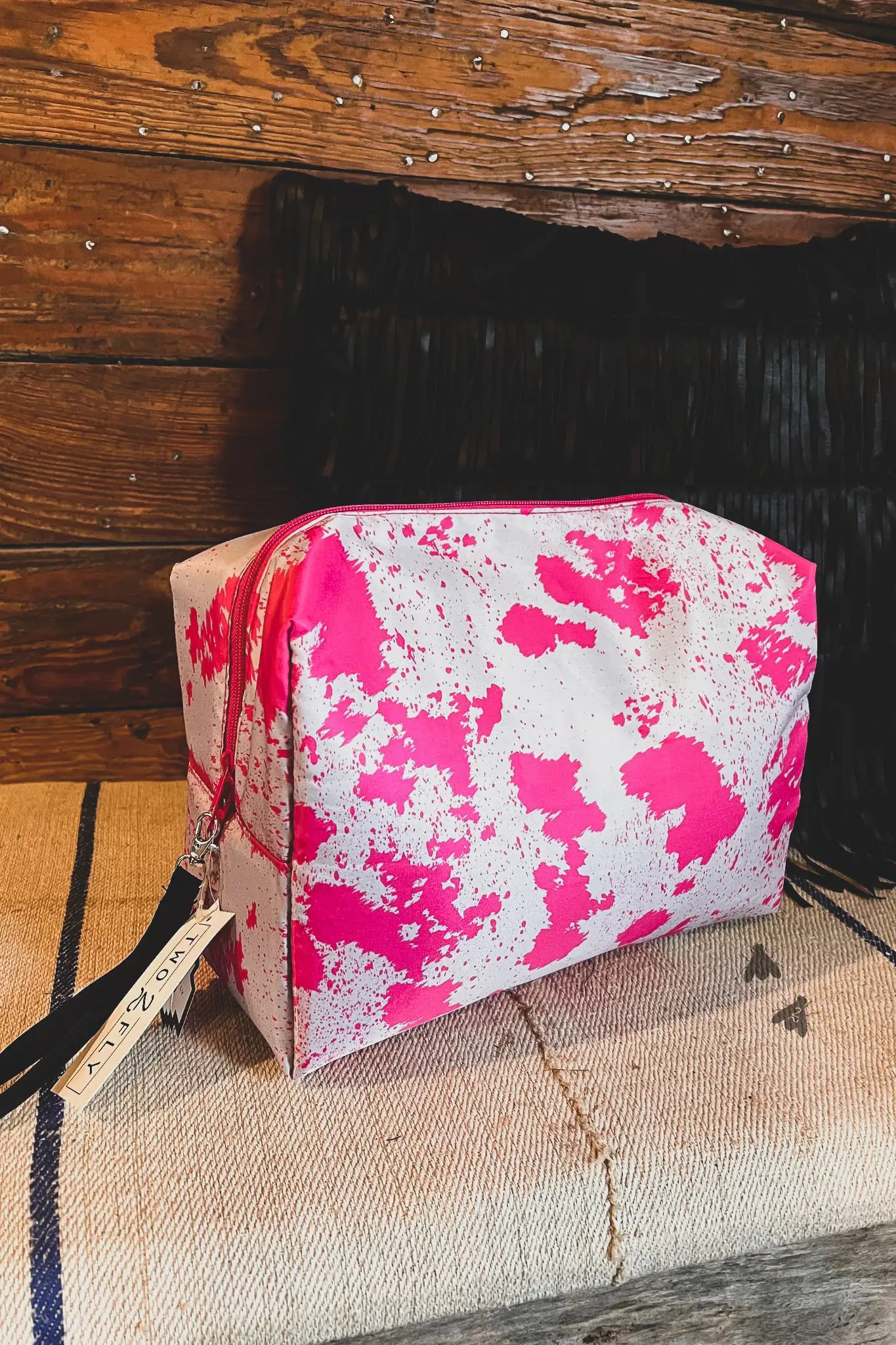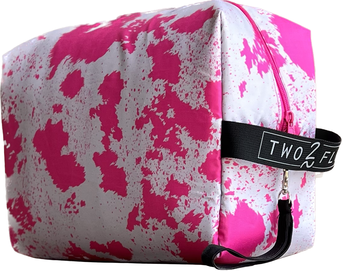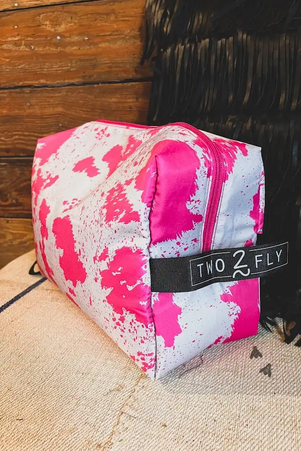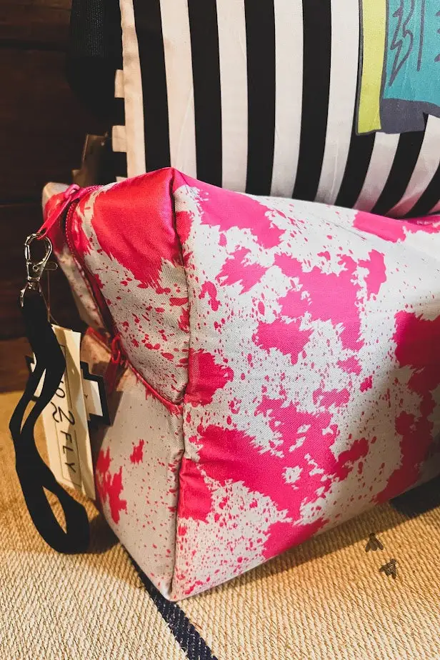 Get this cute pink cowhide print, makeup traveler bag and stow your traveling items here. Large enough for some shoes, your straightener,shampoo and conditioner. Size 12″ x 8″ x 5″