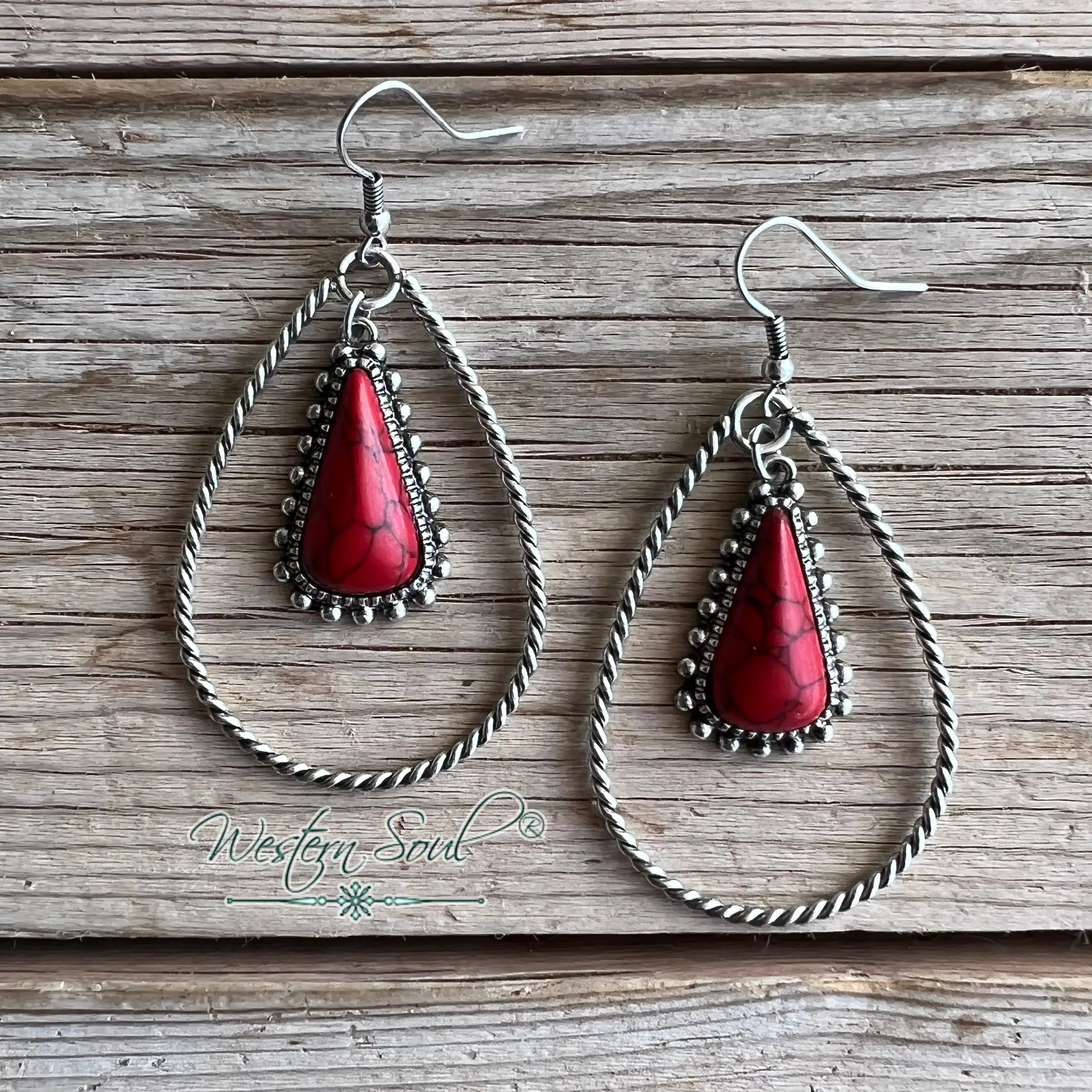 Women’s dangle earrings with a teardrop rope design and a coral-colored pendant.Â