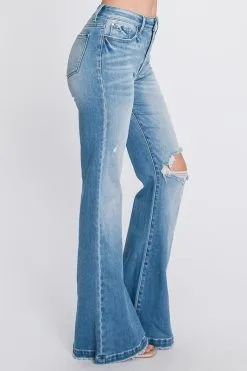 L&B Apparel Plus Size Mid Wash High Waist Flare Jeans W/Knee Rips