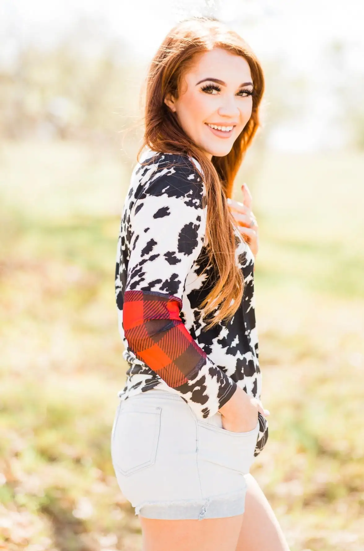Women’s cowhide print top with plaid sleeve and pocket detail. Please note the plaid detail on sleeves and pocket is a sheer material.
