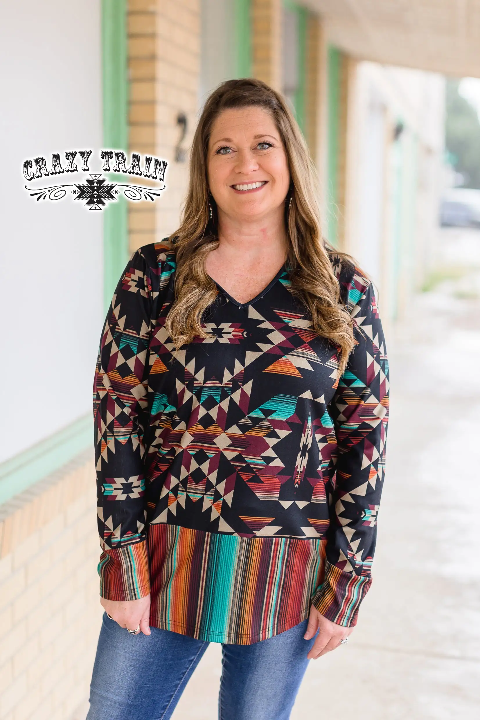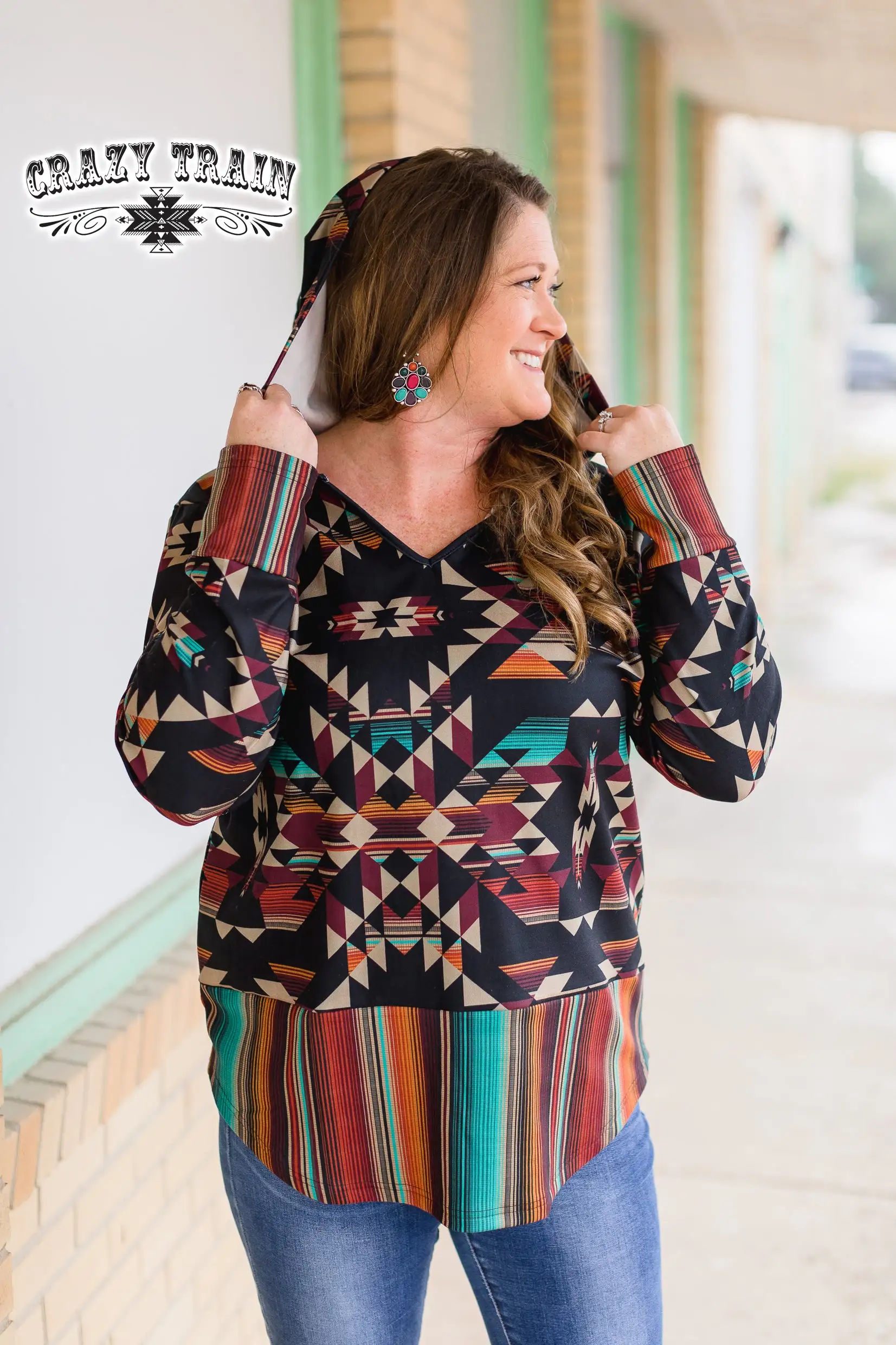 Women’s Aztec print hoodie with serape accents.Â
