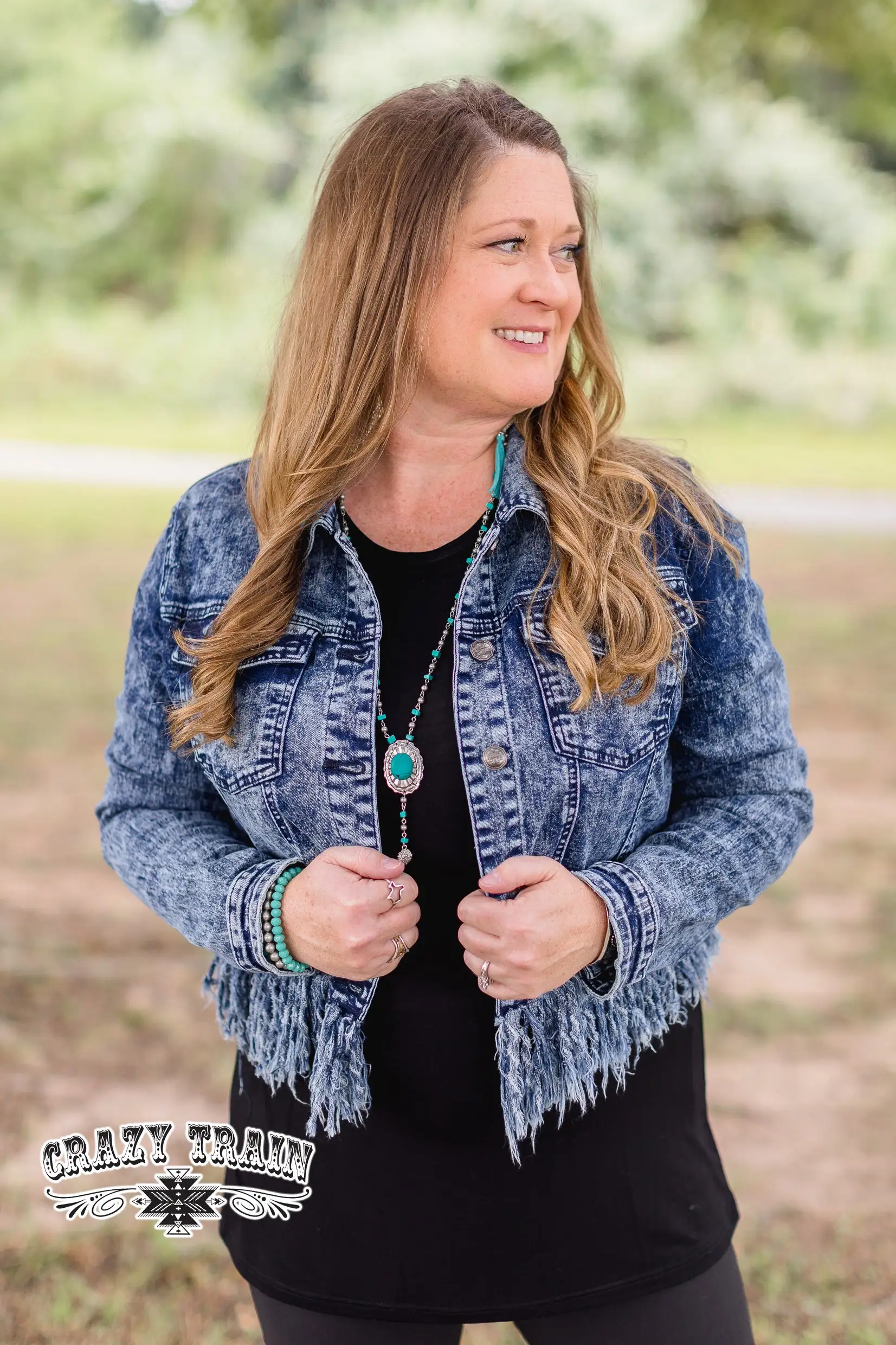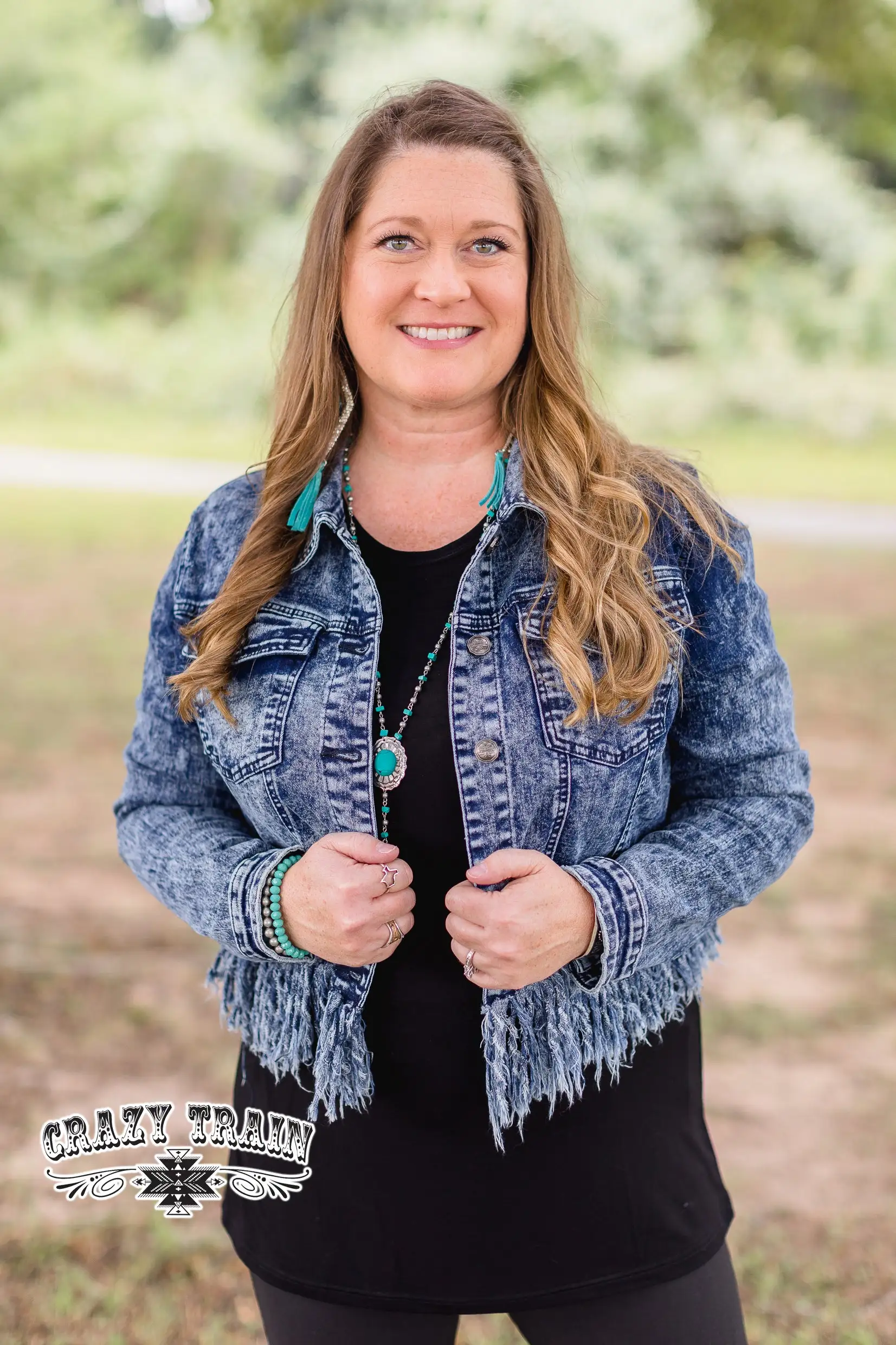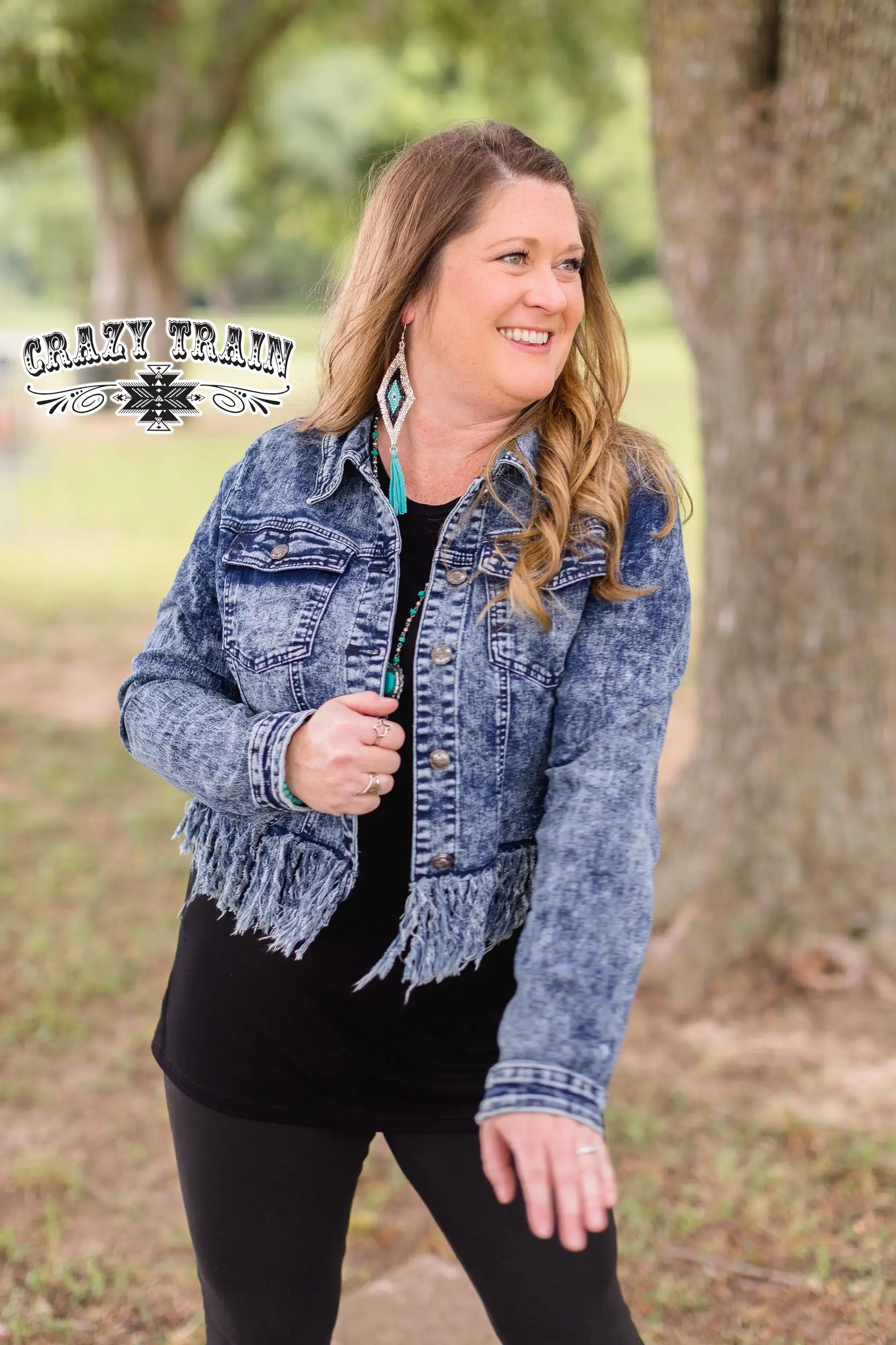 This cute denim women’s jacket has fringe at the bottom hem. Great to wear with dresses or to complete your style with leggings and boots. Definitely a must have for this season! It is running true to size and it’s stretchy for the ultimate comfort.Â