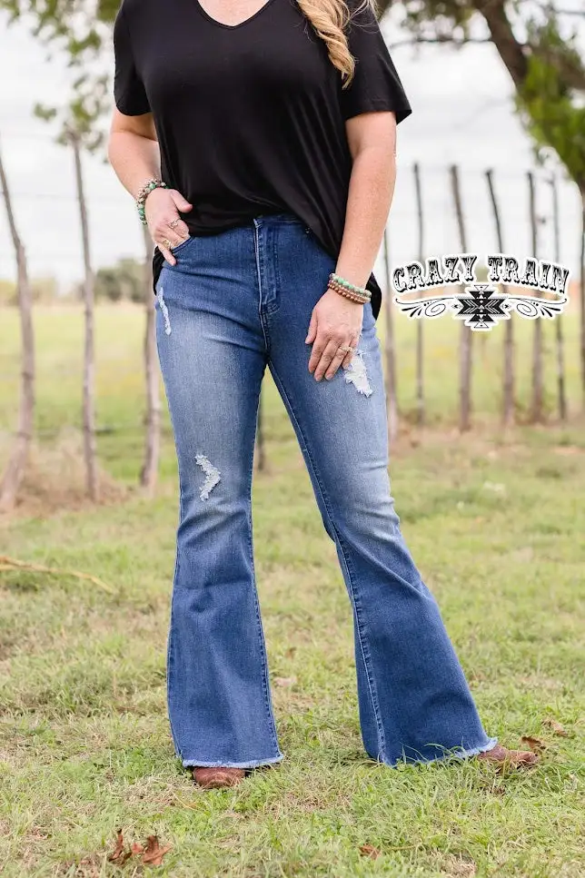 The latest new Crazy Train jeans are here. These short bell bottom women’s high rise jeans have a raw bottom edge, front and back pockets and belt loops. Perfect for shorter ladies with an inseam ranging from 30” to 31.5”.