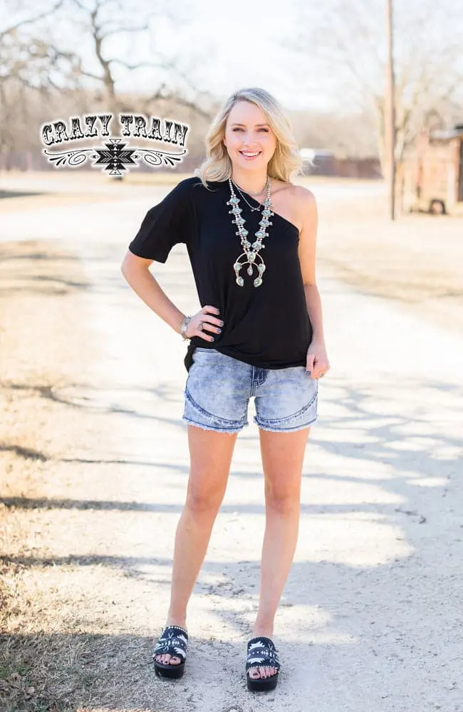 These new Crazy Train Shorts have some cute details. You’ll love the fringe accents and Aztec design on the back pockets. The spandex in them makes them comfortable and stretchy.