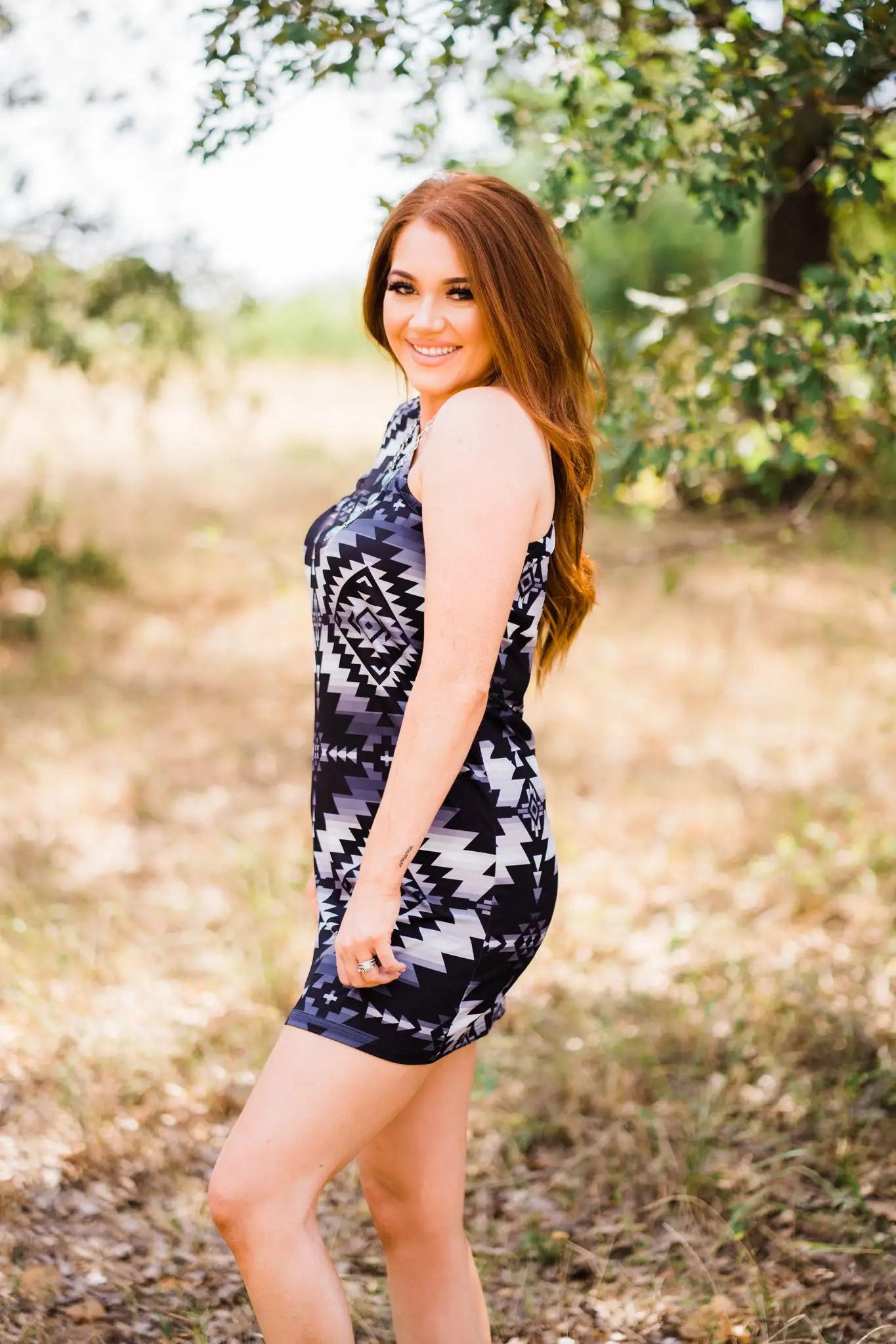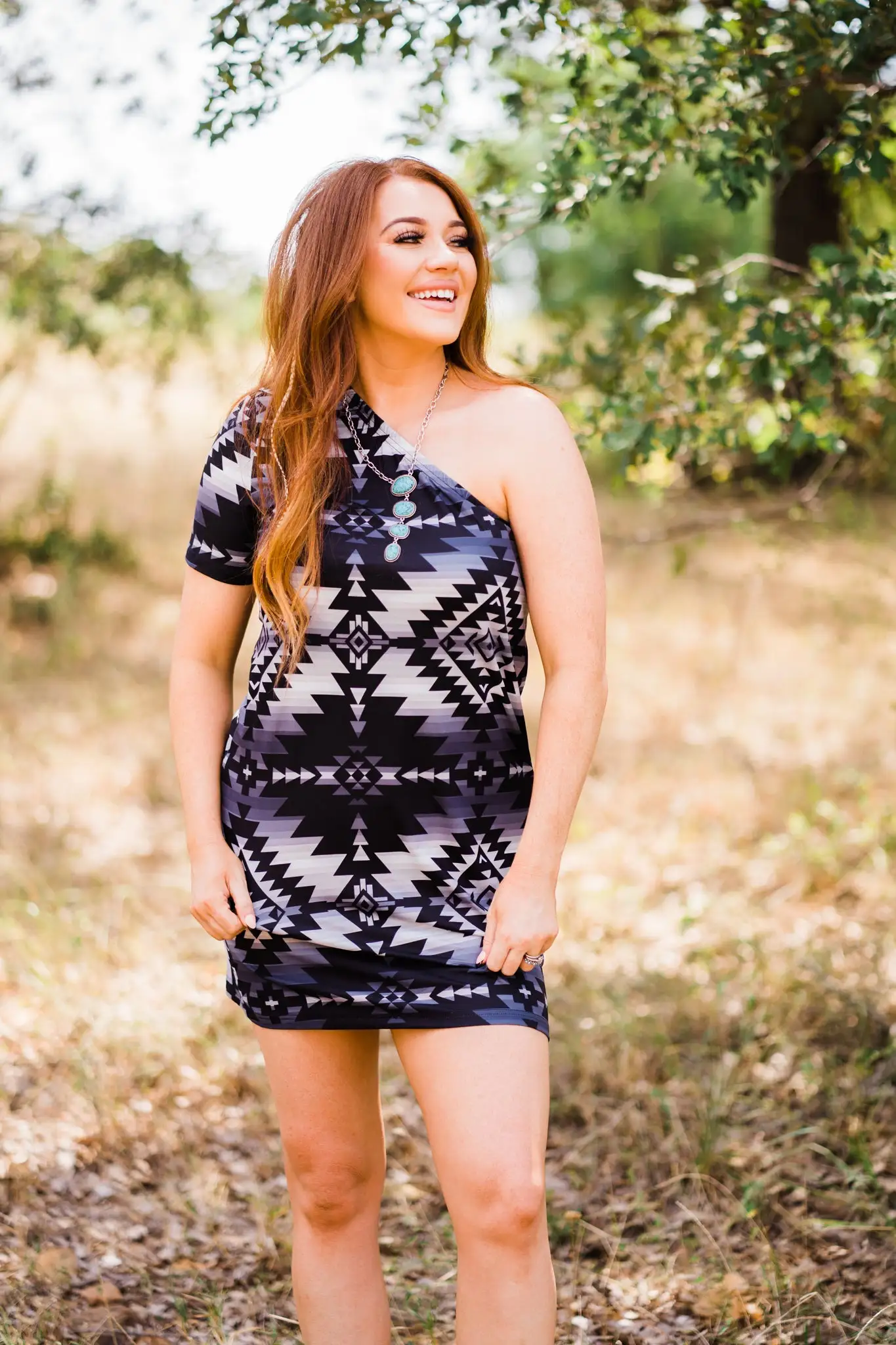 Women’s new Crazy Train short sleeve mini dress. Features one cold shoulder and a pretty black Aztec print.Â