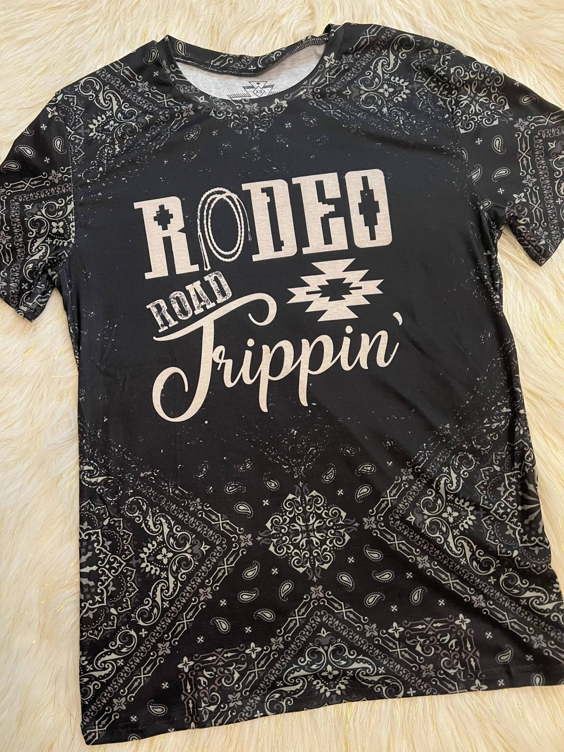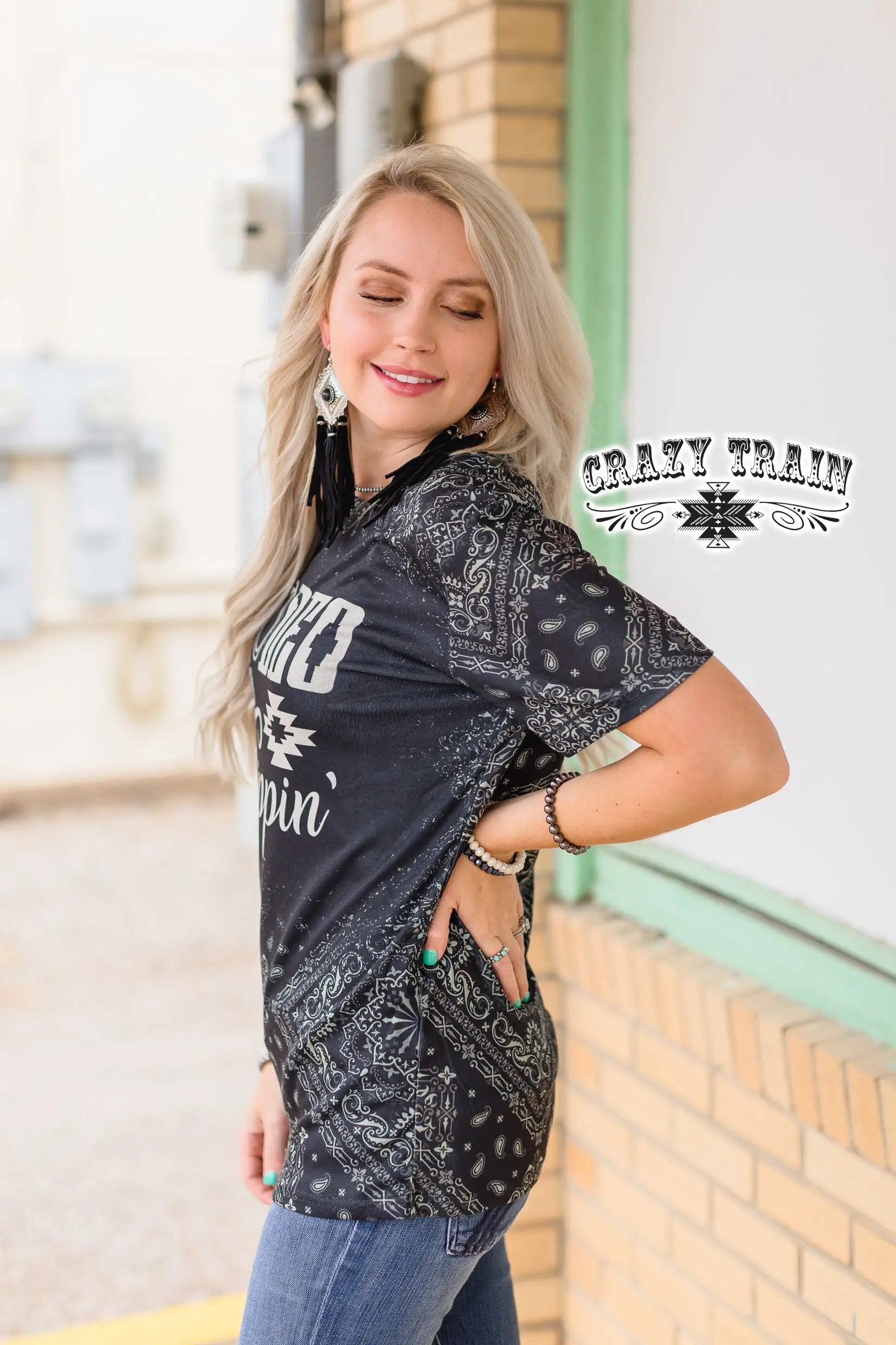 Hey, cowgirls. You need this fun women’s westerns graphic tee. You’ll love the bandana background and graphic design.