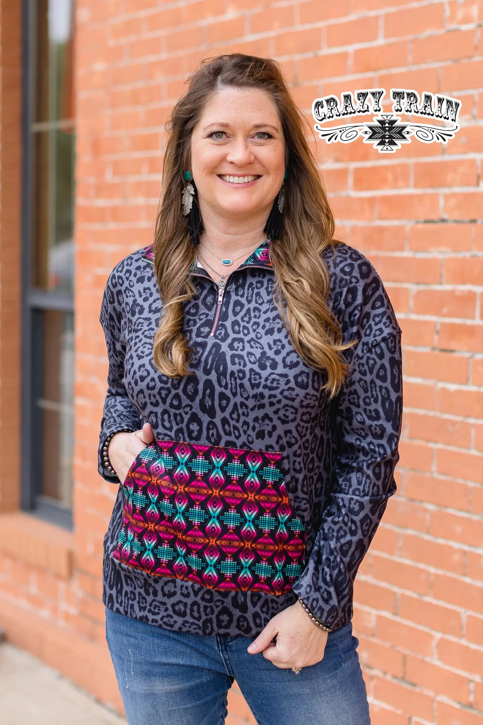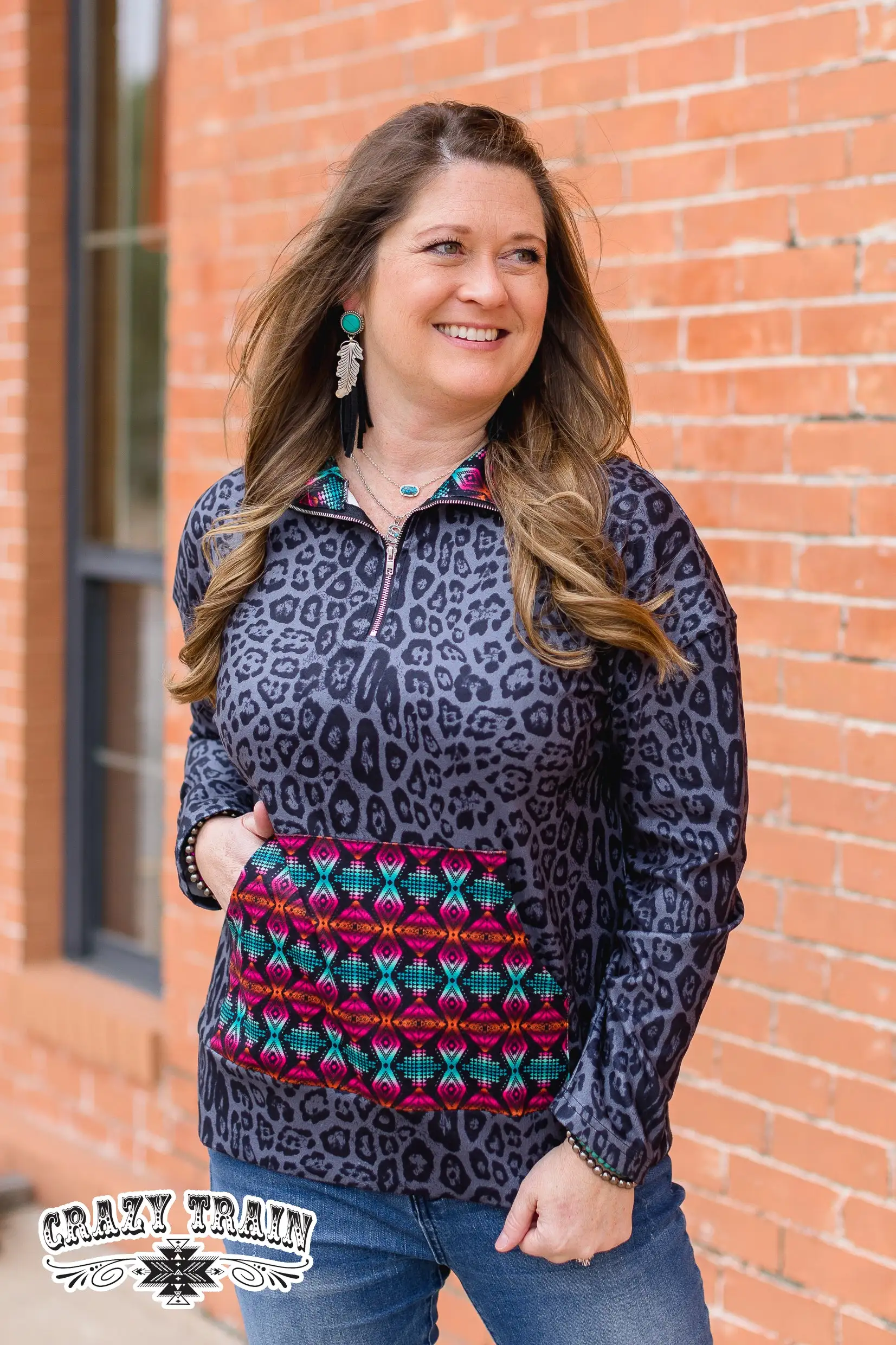 Women’s grey leopard print pullover with a bright Aztec print accent on collar and front pocket.Â