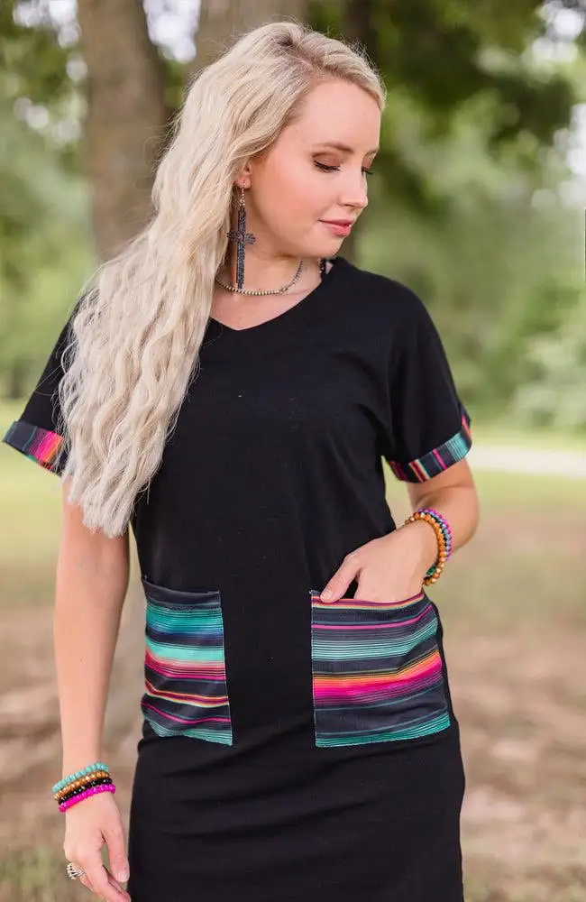 This cute t-shirt style Crazy Train dress is a flattering fit for all body types. The front pockets and matching serape print detail on the sleeves add just the right touch.Â