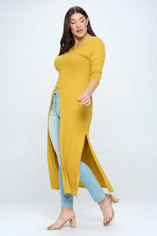 This pretty ribbed tunic has 3/4 sleeves, an open front and side slits.