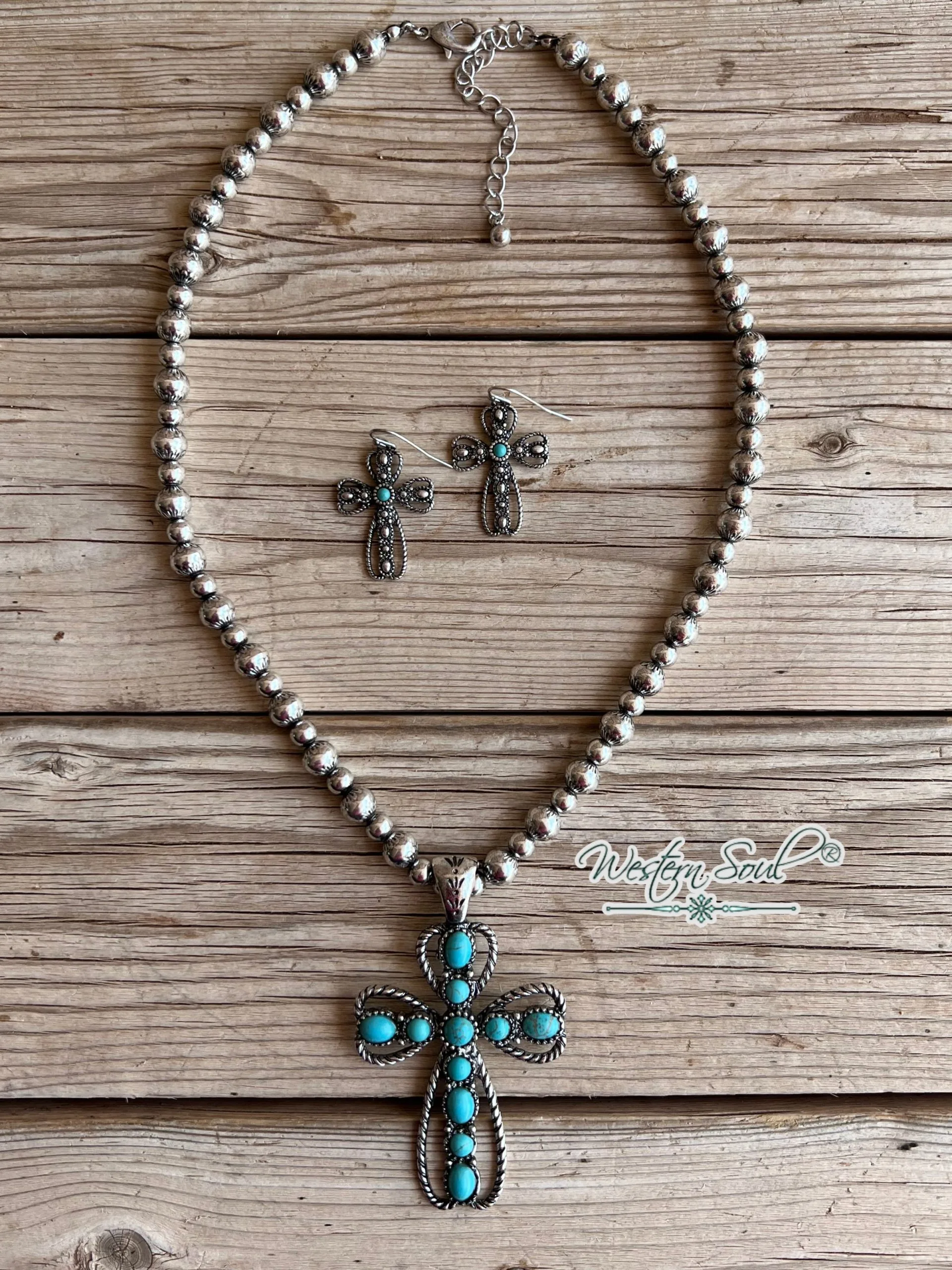 This Western Cross Necklace Set is a look that’ll lasso your heart! It features a cross pendant and matching earrings for a timeless style that will have heads turnin’ to get a second look.Â