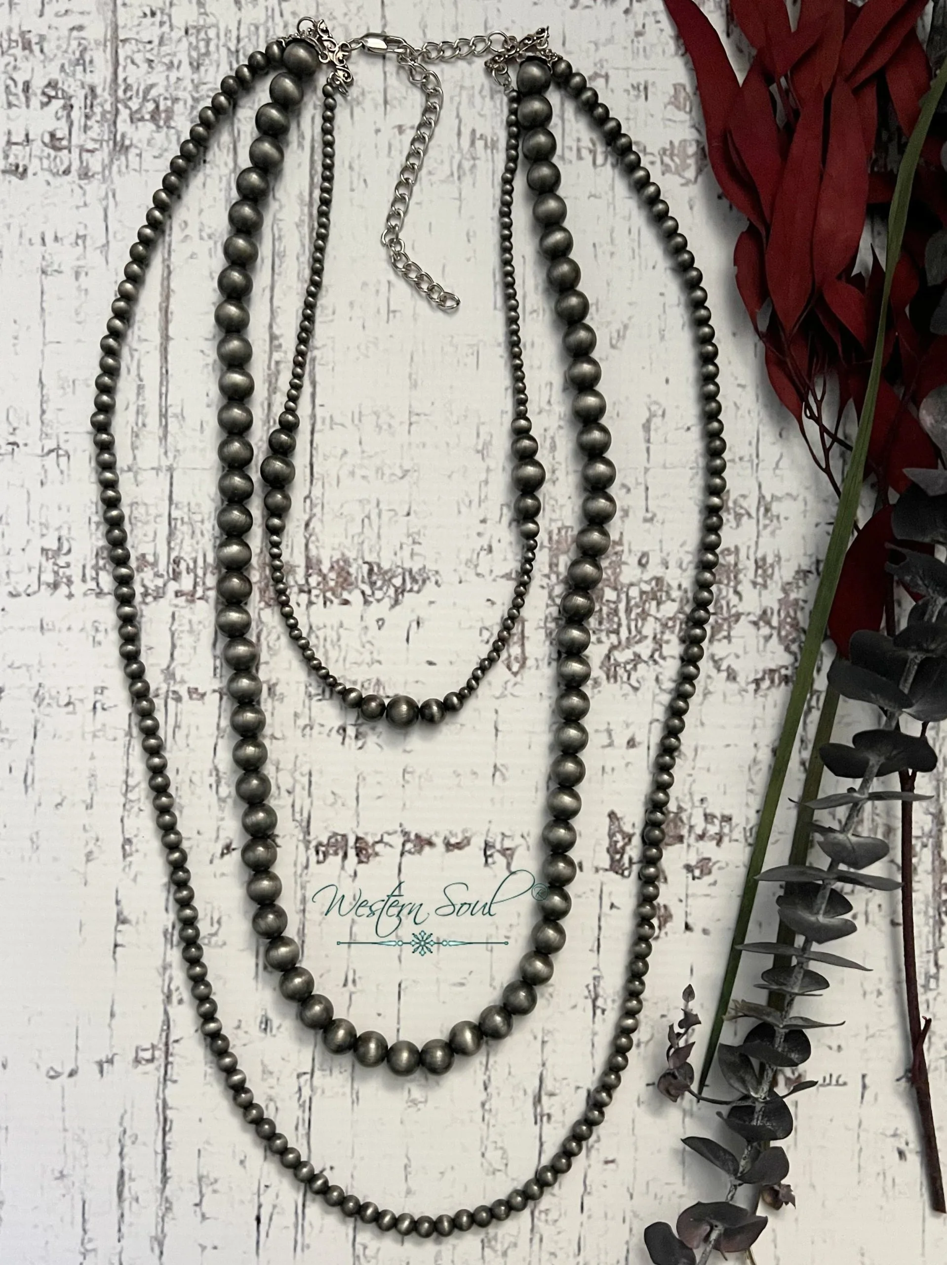 Navajo style pearl layer necklace measuring 15″, 23.5″ and 29″