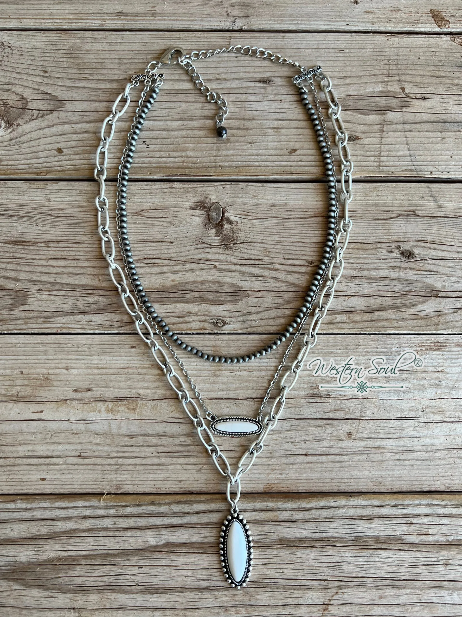 20″ Long, Multi-strand Necklace, Natural White Pendant Natural stone may vary in size, color or shape