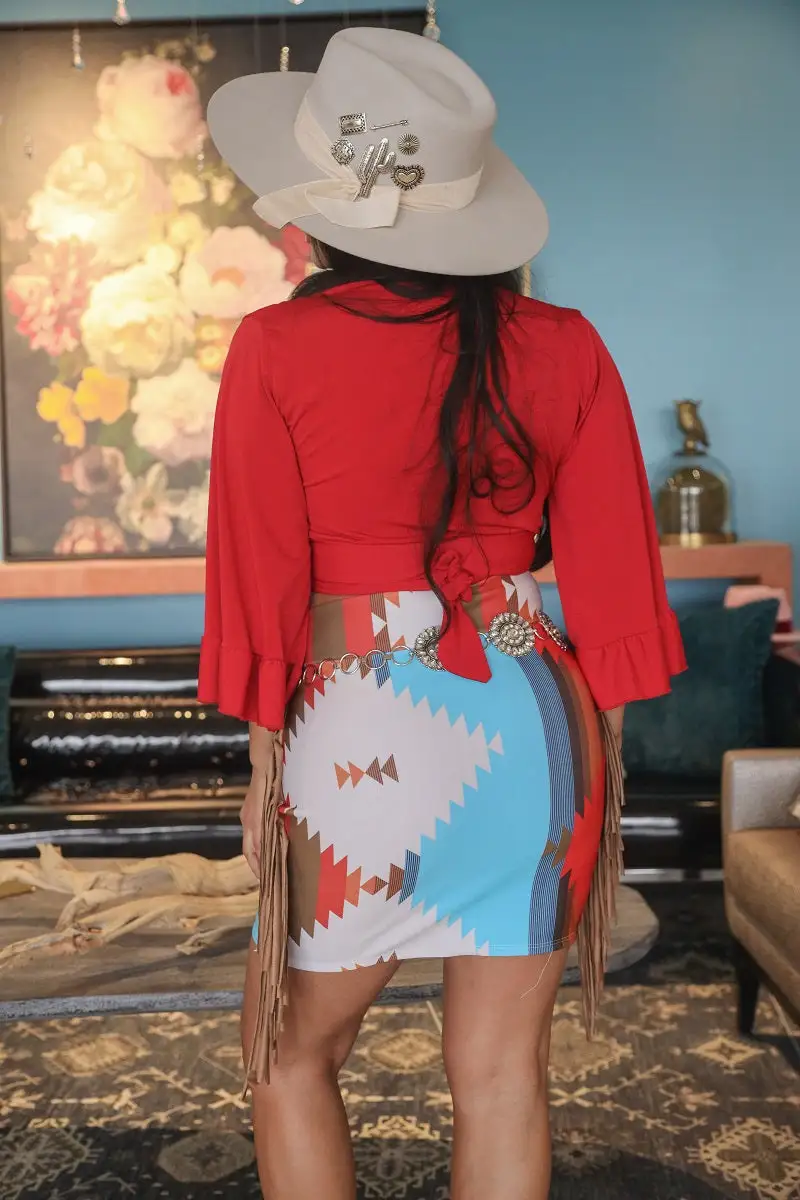 This Aztec print mini skirt is here to add some serious style to your wardrobe! It’s stretchy and comfortable so you can rock it with confidence, plus the fringed side gives it an extra touch of pizzazz. Look good and feel good with this eye-catching skirt!