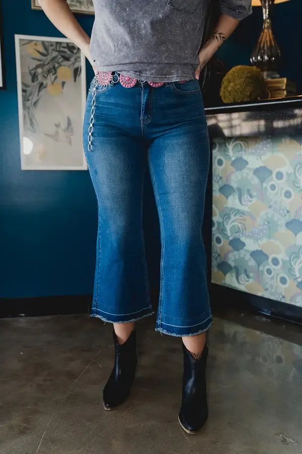 These Dark Wash Wide Leg Capri Jeans are perfect! They offer a comfortable and stretchy fit, making them ideal for everyday wear. The dark wash gives them a stylish, classic look that pairs easily with any top. Plus, the wide leg cut ensures you’ll have a flattering silhouette. The feature a raw bottom edge, so they can be trimmed as needed. Whether you’re running errands or heading to a night out, these jeans are sure to keep you looking and feeling great.