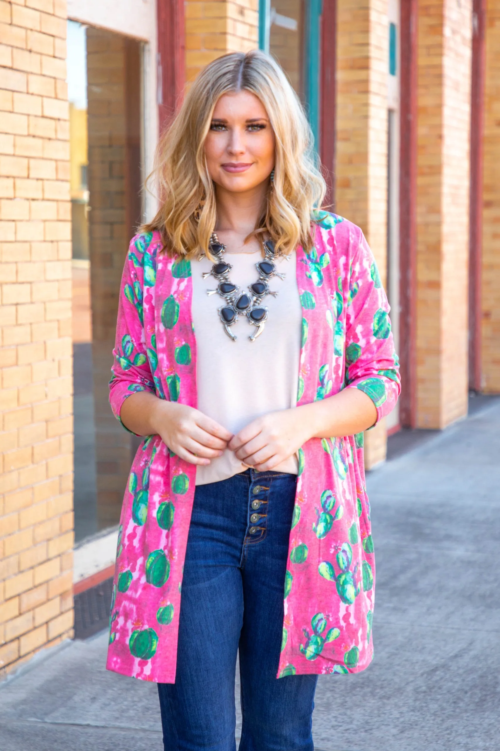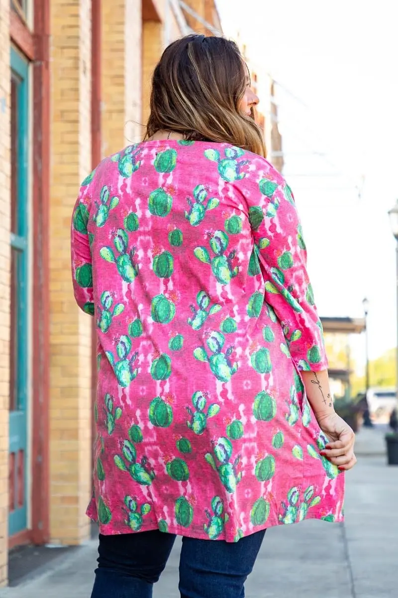 Cute women’s hot pink 3/4 sleeve cactus tie dye kimono. Layer with your favorite top and jeans, shorts or a skirt..Â