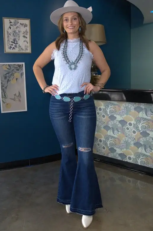 Women’s extreme flare button fly jeans in dark wash. Has rips at knees.Â
