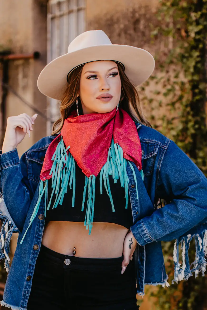 This brightly colored, tooled print fuchsia colored wild rag is adorned with studs and fringe.Â