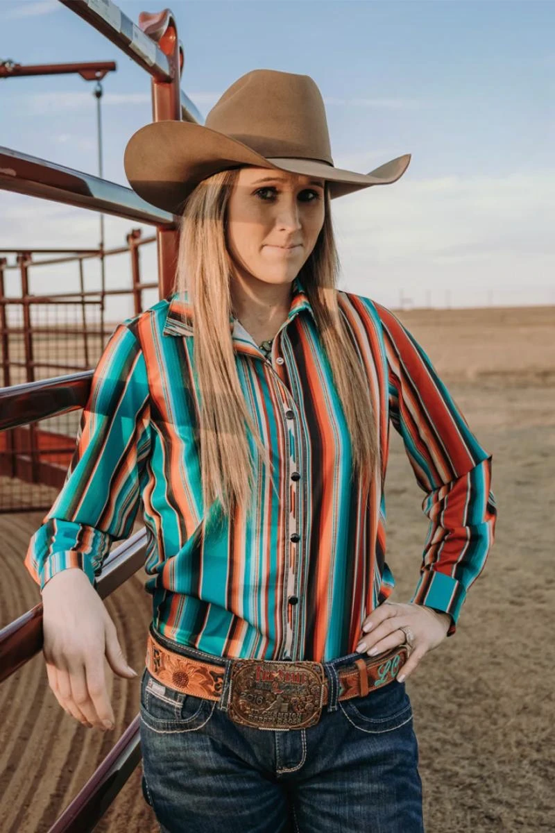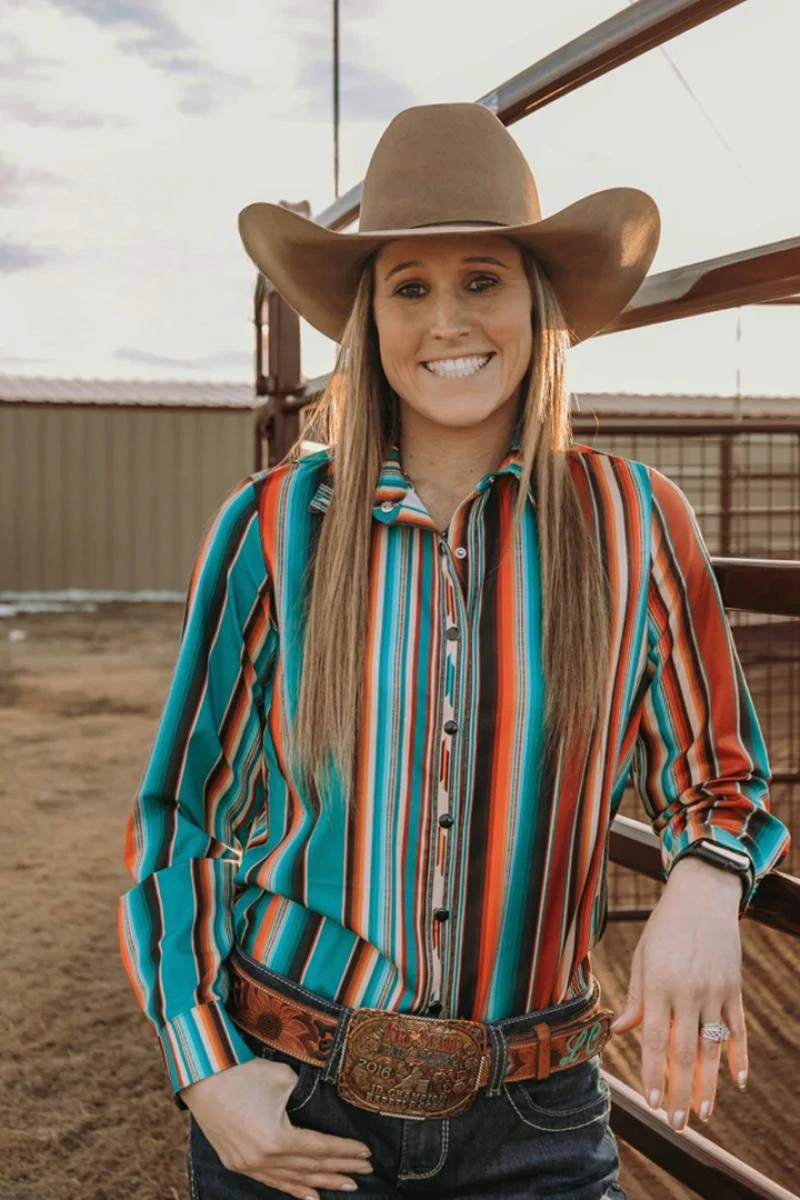 The Arena Lights Top is the perfect choice for any western outing. This women’s button-down shirt features a classic western design with a modern twist. The lightweight fabric is comfortable and breathable, while the snap closure adds a stylish touch. The fit is flattering, and the fabric is comfortable, ensuring that you look your best no matter the occasion. Whether you’re heading to the rodeo or a night out on the town, the Arena Lights Top is sure to please.Â
