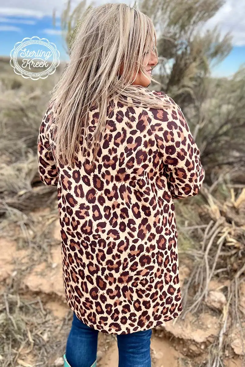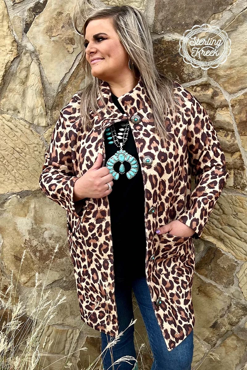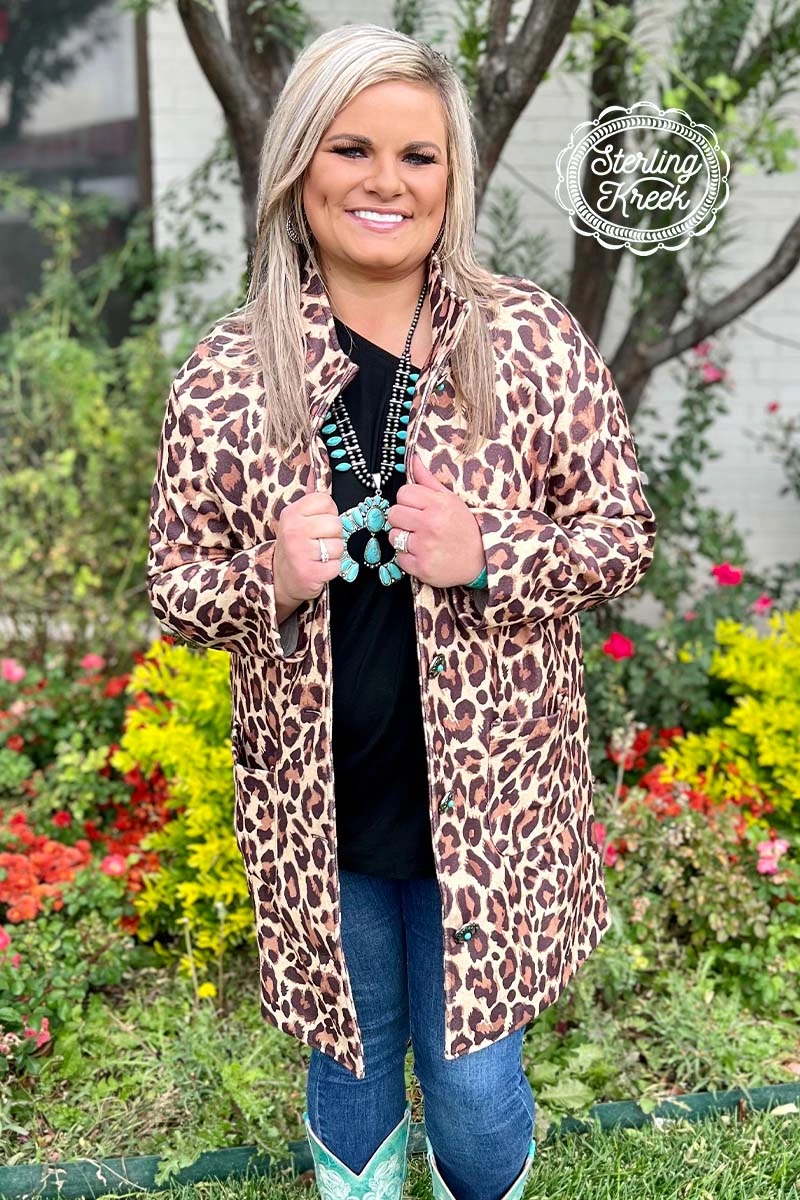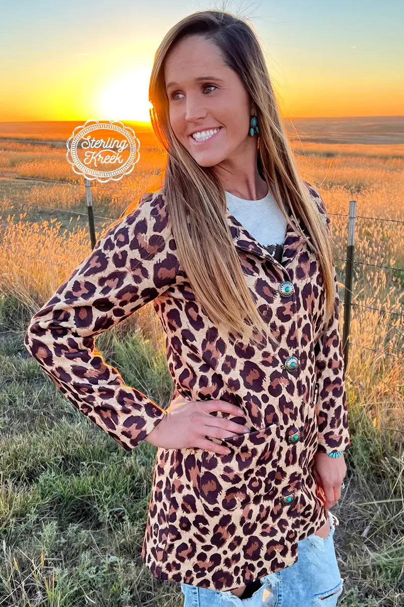 This leopard print jacket is a heavier weight jacket that is perfect for the colder weather. It features 5 concho style buttons and front pockets.