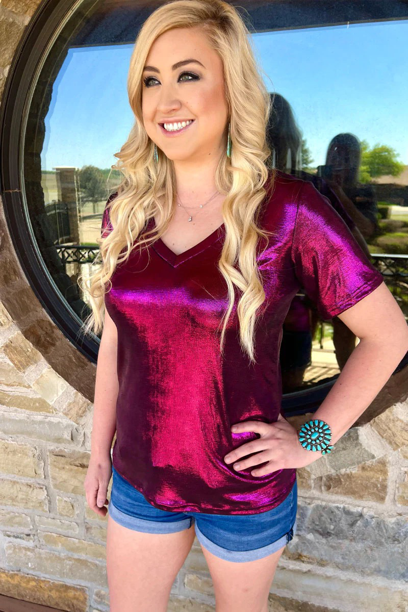This Pink Cadillac Top will add a touch of fun to any outfit. The top features a subtle shimmer that adds a bit of glamour to your look. Perfect for a night out, it will surely turn heads!