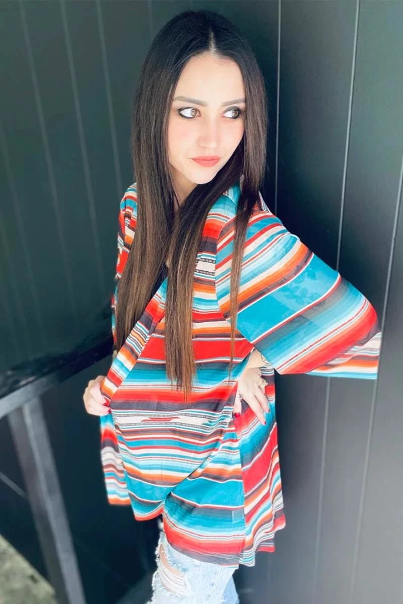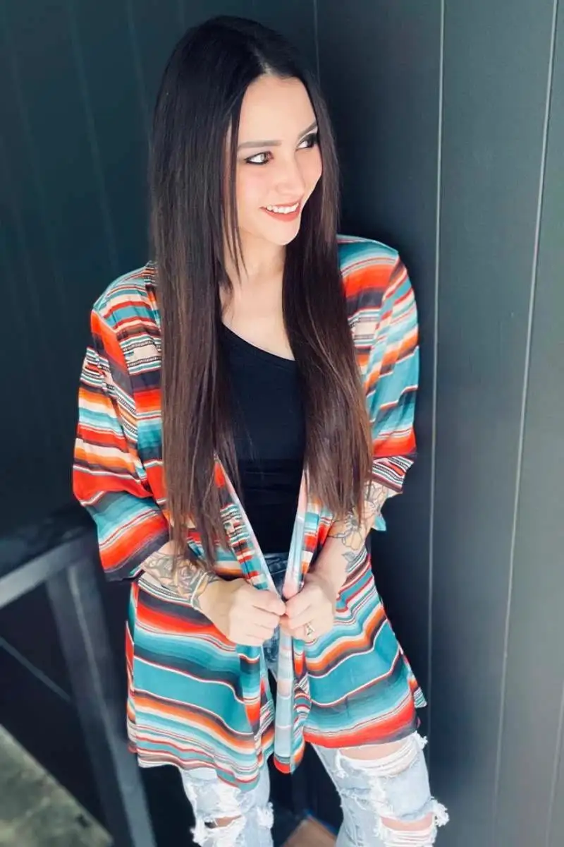 This Santa Fe Sunrise Cardigan is the perfect way to add a touch of southwestern style to any outfit. Crafted from a lightweight mesh, stretchy material and featuring a stunning serape print, this one size fits all cardigan is sure to become a favorite in your wardrobe. The perfect layering piece for any season, this cardigan is sure to keep you warm and stylish.