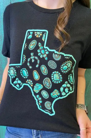 Show your Texas pride in style with this one-of-a-kind Texas In Turquoise Tee! This cool and eye-catching design features a Texas shape full of vibrant turquoise conchos for a look that’s sure to stand out.