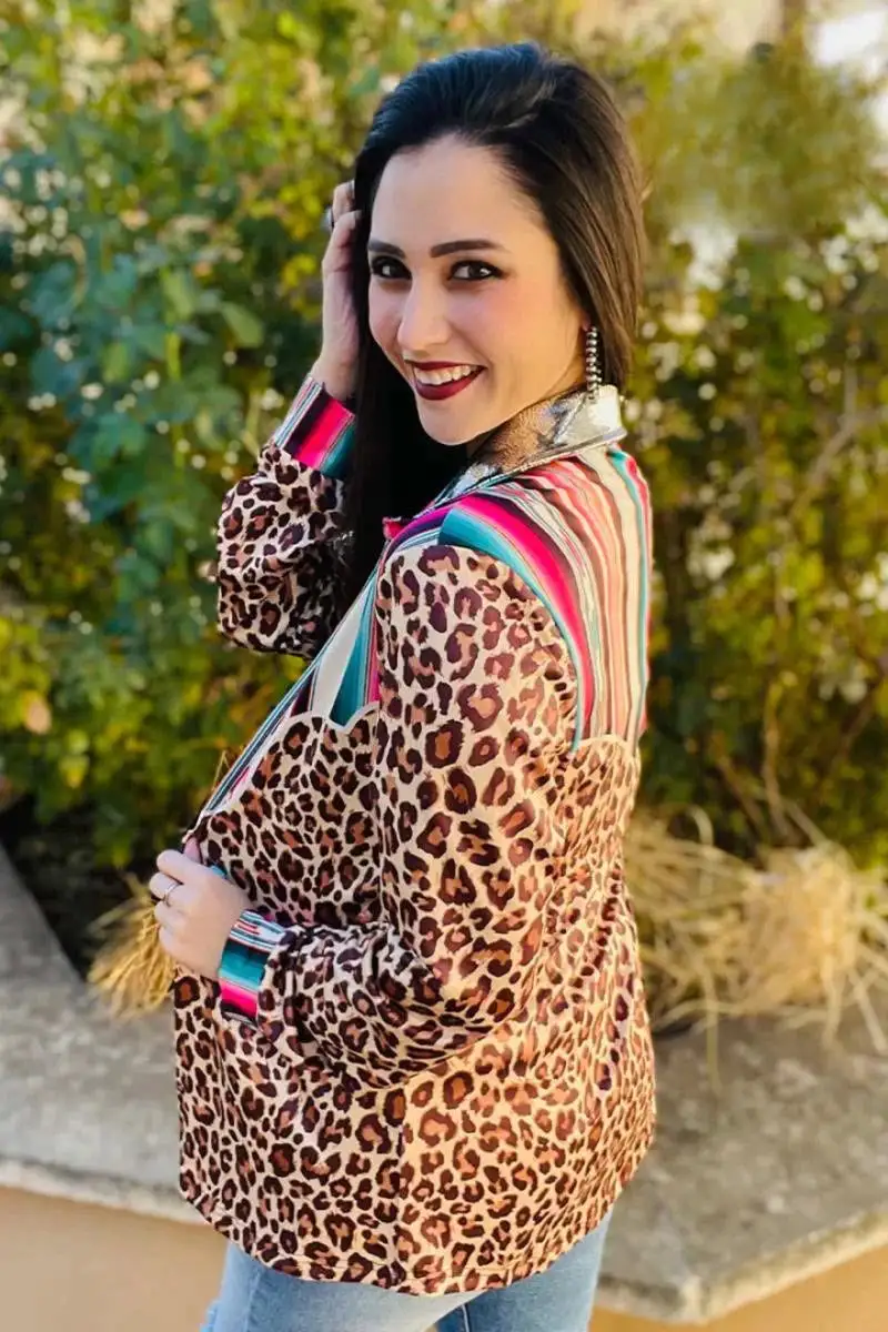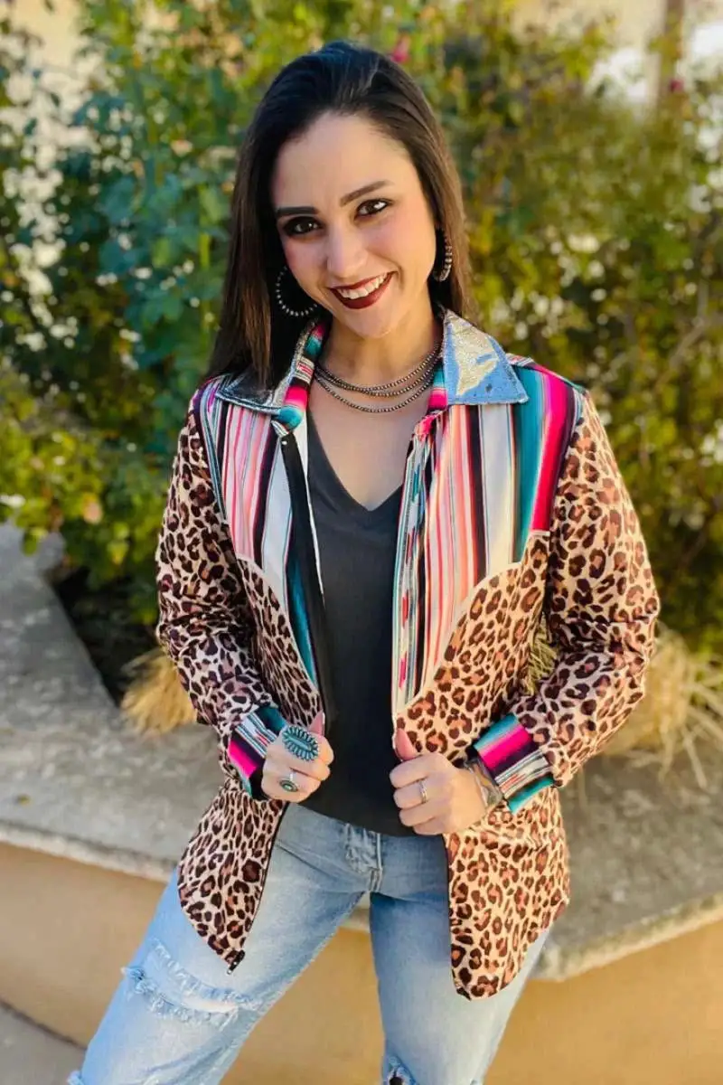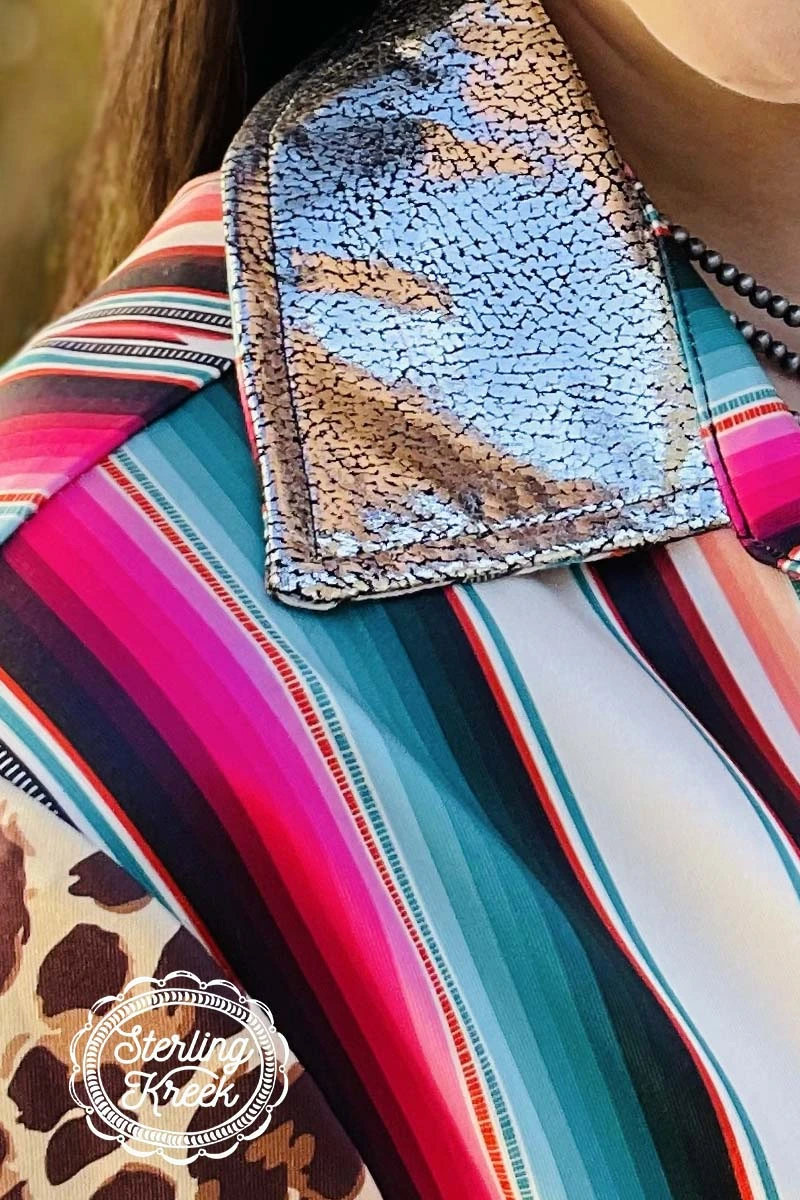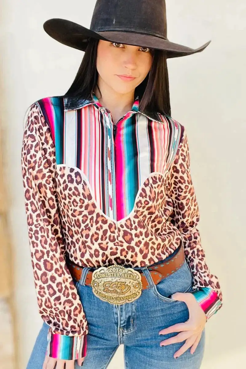 The Barrel Race Top features a metallic look collar and beautiful serape and leopard prints and a zip up front. The lightweight fabric and comfortable fit make it ideal for long days of riding and competing. You’ll look great and feel great in this top, making it the perfect choice for any barrel racer.