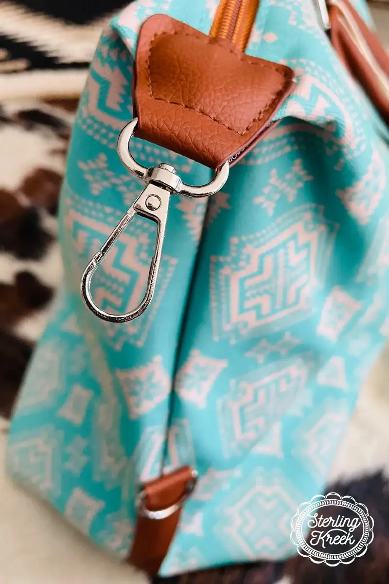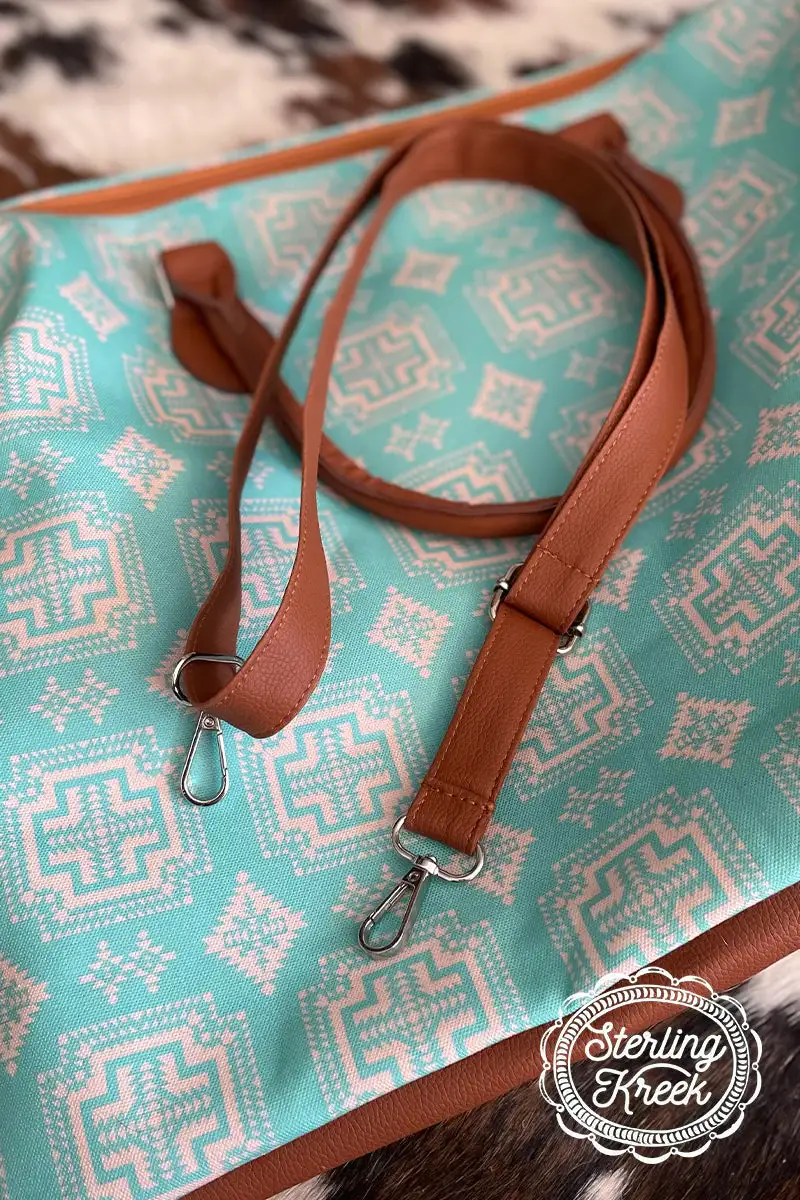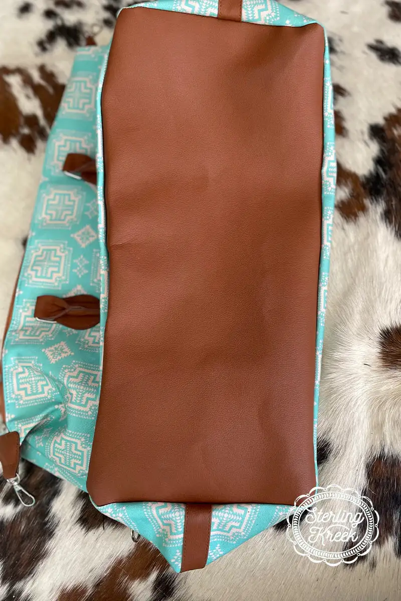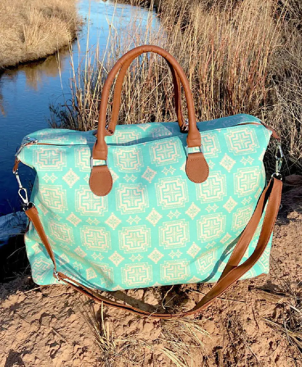 The perfect weekender bag. It features two interior open pockets and an additional interior zipper pocket. This features our “Down in the Canyon” pattern with brown faux leather accents. This bag also comes with an additional adjustable strap for a crossbody, or an over the shoulder look.Â