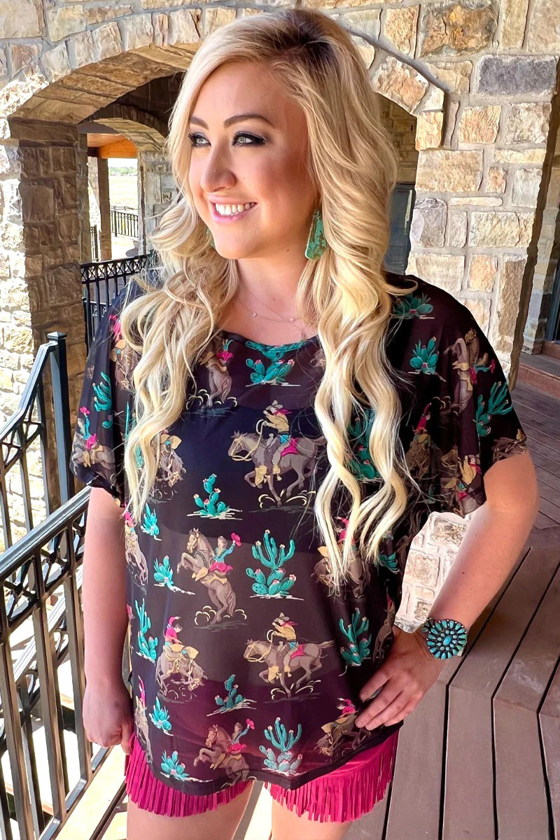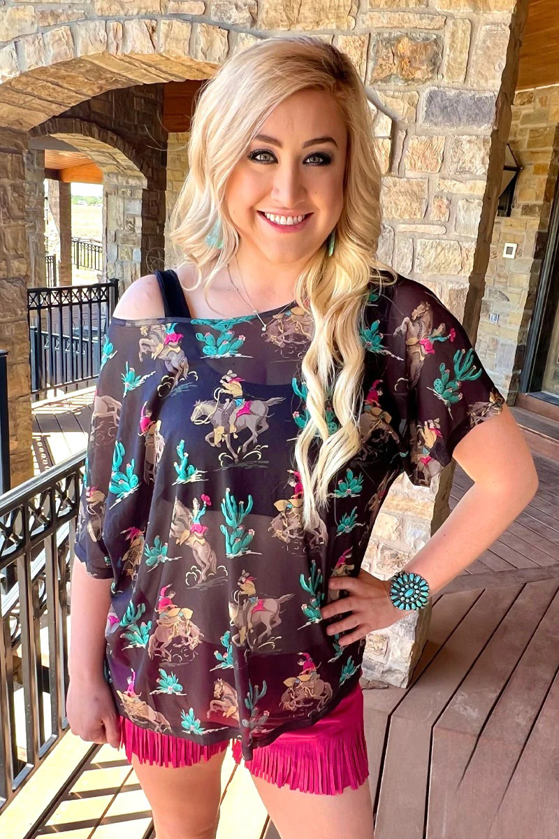 This Wanted and Wild Top is a stylish, downright sassy way to kick up your wardrobe! The striking black hue pairs perfectly with the western pattern, making it the perfect piece to lasso in compliments. Please note this is a mesh top.Â