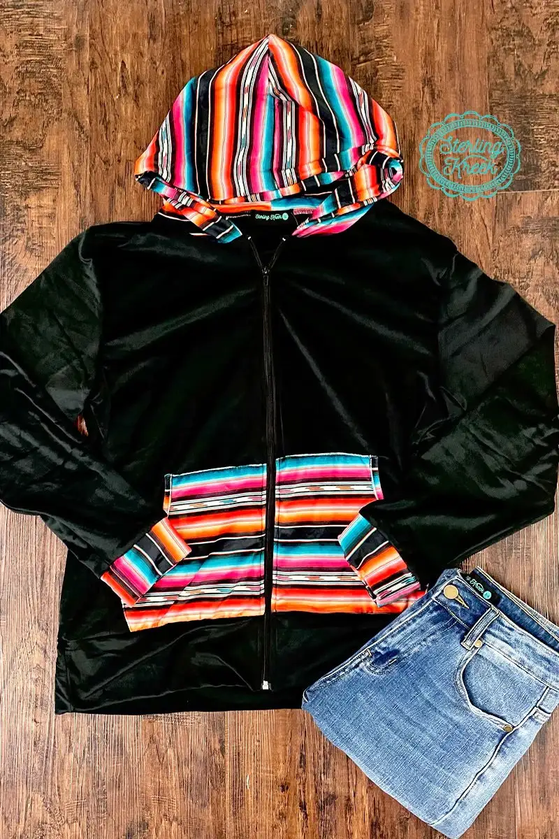 Stay warm and stylish in the super soft velvet feeling hoodie. The serape detail really stands out on this one.